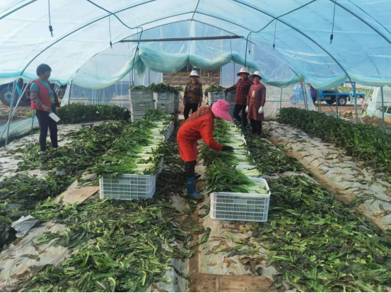 走进产业示范园,映入眼帘的一片片绿油油的莴笋,个个根粗叶茂,长势喜人。大棚内,随处可见村民们忙碌的身影。砍削、除叶、打捆、搬运、称重、装筐、上车,只见村民们动作熟练、干净利落地完成着一畦畦莴笋的采收工作,现场一派繁忙热闹的丰收景象。