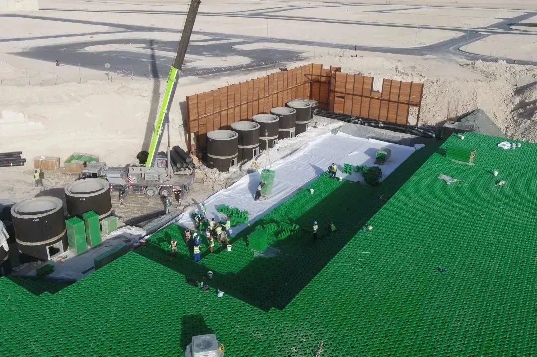 这一项目的雨水收集系统规模庞大,52个渗透池总容积约为65万立方米。其中,超过1万立方米的渗透池39个,最大的可达2万立方米。渗透池内整齐排列的“积木”,就是雨水收集系统的核心结构,也是建设“海绵城市”的重要支撑。雨季时,分布在各个街区地下的渗透池有效收集地表雨水,然后在48小时内将内部水回灌地下。未来,这些分布在各个街区的渗透池将服务于穆特拉新城的水资源循环利用和生态环境保护。