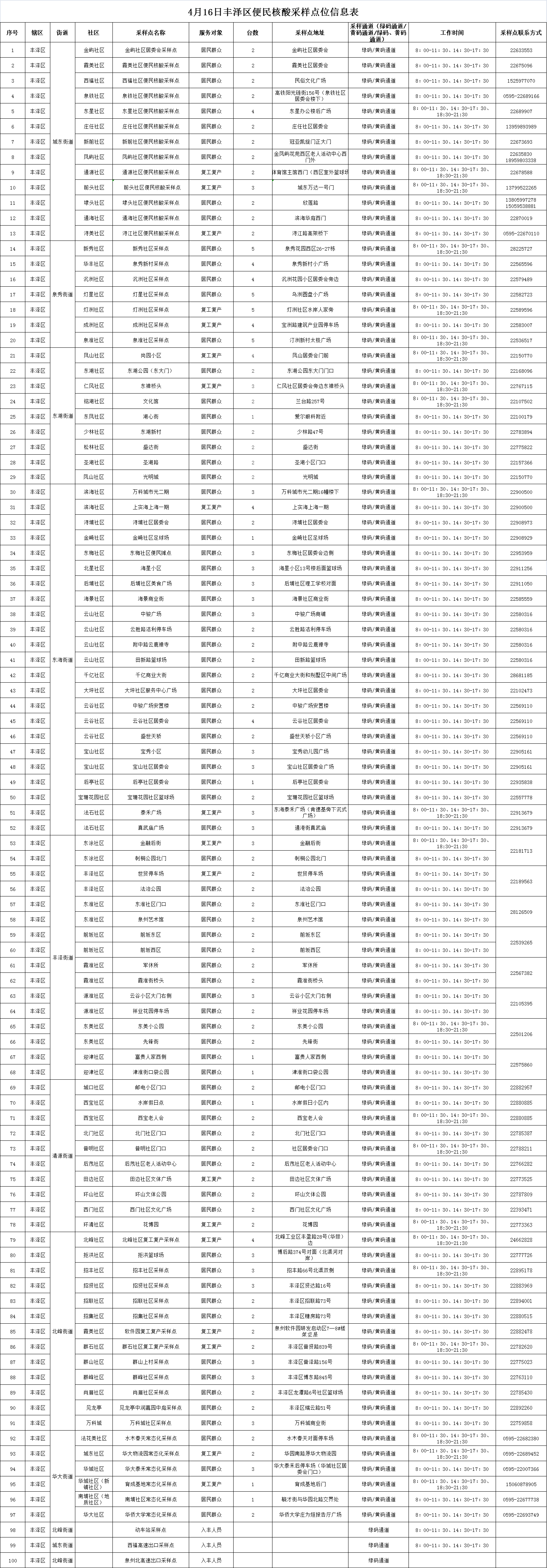 丰泽区调整公布4月16日100处便民免费核酸采样点,为居民提供采样服务。请广大居民根据需要有序前往,并做好戴口罩、保持“2米线”距离等个人防护措施。