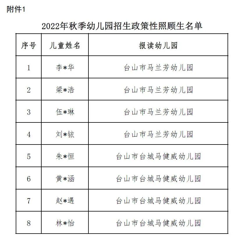 根据《台山第一幼儿园、台山市马兰芳幼儿园、台山市台城马健威幼儿园2022年秋季招生通知》要求,根据个人申报情况,经审核,李*华等8位适龄幼儿拟为上述三所幼儿园2022年秋季招生政策性照顾对象(名单详见附件1)。同时,自愿报读三所幼儿园电脑派位幼儿共1089人,其中台山第一幼儿园269人,马兰芳幼儿园405人,马健威幼儿园415人(名单详见附件2)。现将有关情况一并进行公示,接受社会各界监督。