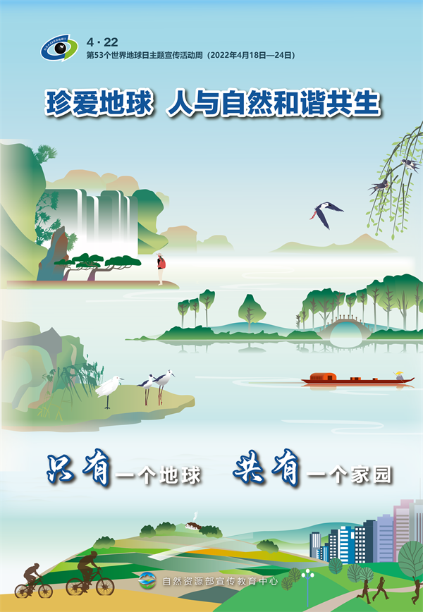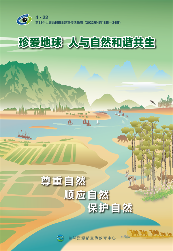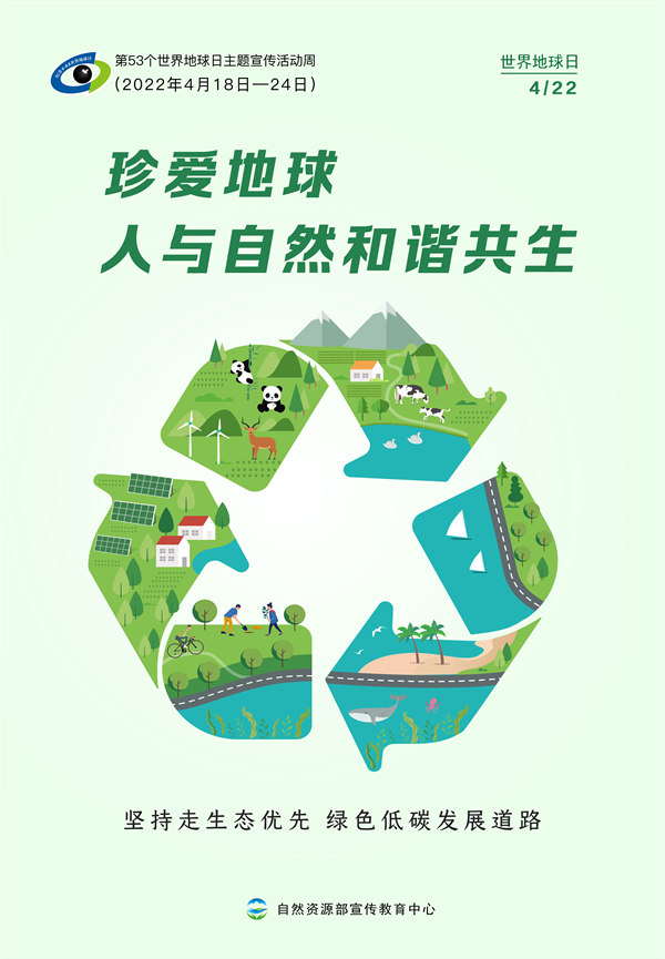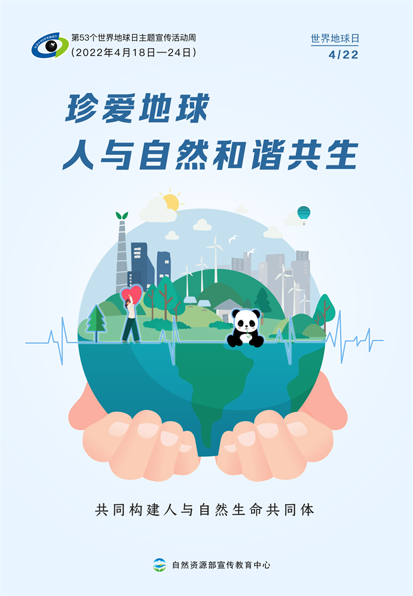 2022年4月22日是第53个世界地球日,4月18日至4月24日是世界地球日主题宣传活动周。今年的宣传主题是“珍爱地球 人与自然和谐共生”。值此之际,自然资源部宣传教育中心策划制作了系列宣传海报,倡议全社会尊重自然、顺应自然、保护自然,积极践行习近平生态文明思想。