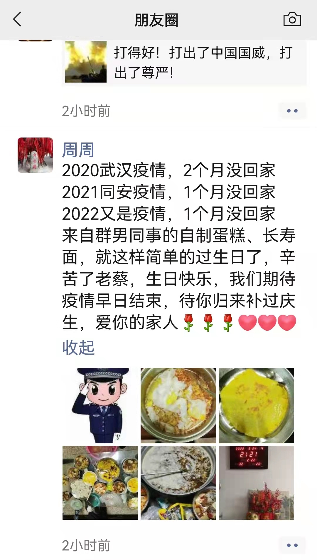 蔡旭阳的爱人也通过微信为他送来生日祝福,这让身在高墙内执勤的蔡旭阳深感家人的理解和支持,也让他干劲倍增,与同事们并肩作战,等待抗疫胜利的那一天!