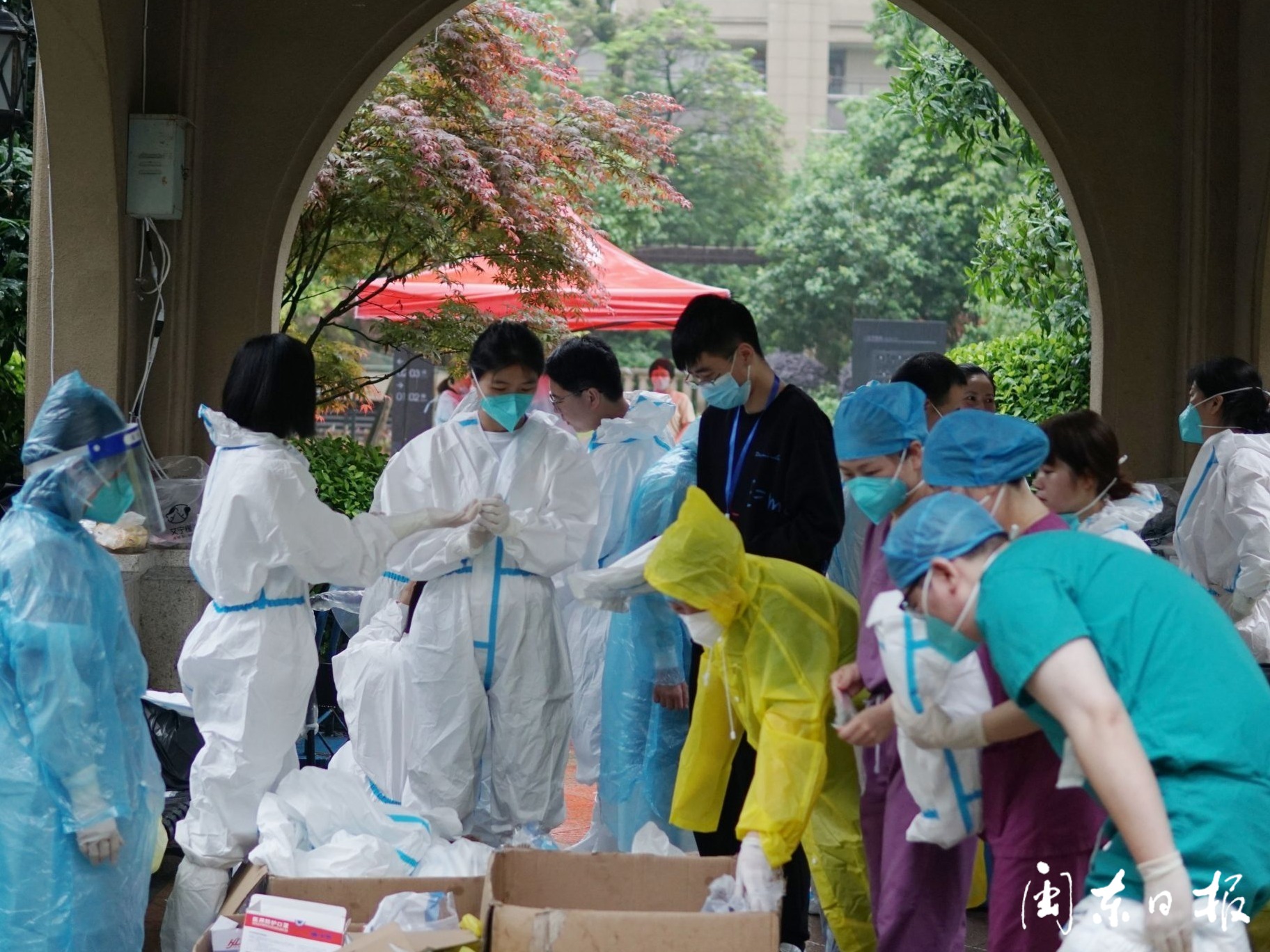 4月27日凌晨5时25分,泰禾红郡小区志愿者正在进行第14轮全员核酸前的集体换装