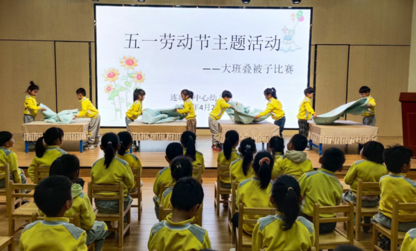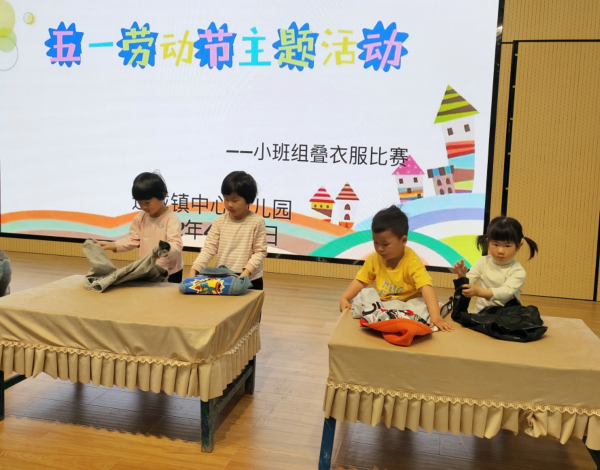 首先,各班教师通过观看图片、视频、故事、课件等,帮助幼儿了解劳动节的由来及意义。知道不同职业的劳动特点和价值,从而懂得尊重他人的劳动成果。其次,为进一步体验劳动的快乐,各年级组根据幼儿年龄特点开展了“生活技能大比拼”活动。为此精心制定了小班“叠衣服”、中班“剥毛豆”、大班“叠被子”等比赛项目。比赛时,小朋友们个个精神饱满、积极参与、表现精彩,在一片欢乐又温馨的氛围中感受了劳动的辛苦,也体验了劳动的乐趣。最后,鼓励幼儿从身边的小事做起,回家也能做一些力所能及的家务,感受劳动带来的洁净与美好。