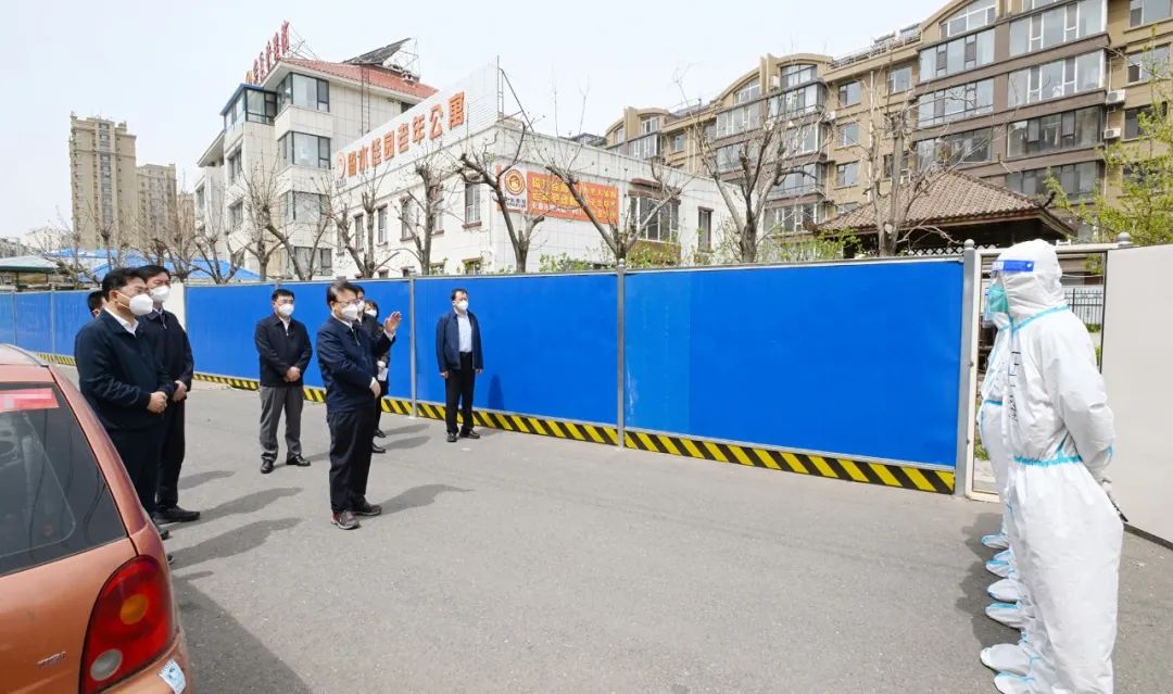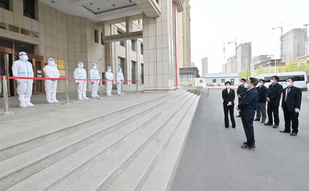 5月4日,省委书记景俊海在长春市实地检查指导重点场所疫情防控、养老事业发展等工作,在仁大医养中心向一线工作人员问好,详细了解防疫措施落实情况。
