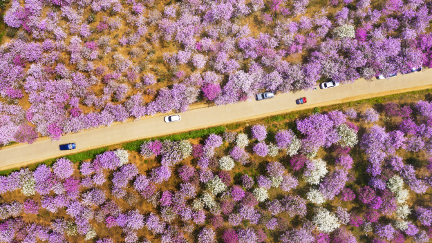 最美人间四月天。国道209线旁,柳州市古木坳路段下陶村超2000亩紫荆花竞相开放,车辆行驶在繁花似锦的公路上,构成了一幅赏心悦目的风景画。