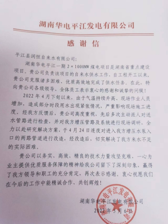 5月6日,县润恒自来水有限公司办公室收到来自湖南华电平江发电有限公司的感谢信,感谢该公司务实、高效、精良的技术力量攻坚克难,一心为业主提供优质服务。