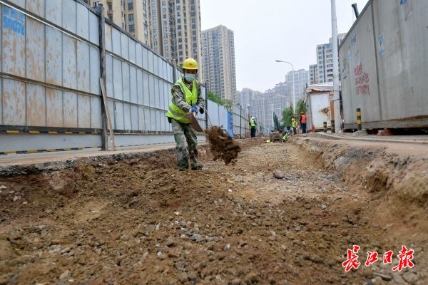 记者在奥园东路向金银潭大道方向走去,发现靠近永旺梦乐城的地段正在铺设雨水管道。