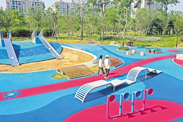 5月7日,在武汉市临空港经济开发区(东西湖区)金山大道和云海路交汇处,市民在新建成的熙龙湾游园里游玩。近日,东西湖区园林局对已投用10多年的熙龙湾小区门前休闲广场进行升级改造,让附近小区近千户居民“推窗见绿、转角遇美”。 (湖北日报全媒记者 倪娜 通讯员 叶宗云 徐卉婷 摄)