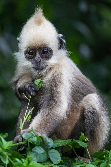 它们以猴群为社会基本结构,新生的白头叶猴全身呈金黄色,之后逐渐长成白头、白肩、长尾巴的模样。