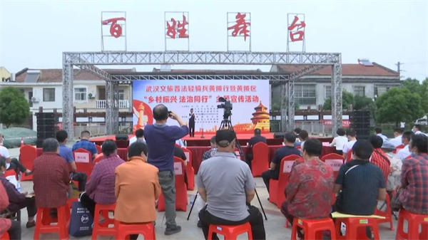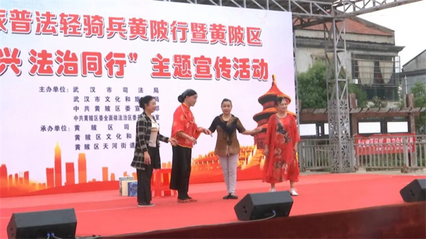 武汉文旅普法轻骑兵团队和黄陂区文化馆现场送上群口快板、配乐诗朗诵、小品等精彩的法治文艺节目,讲述司法为民事迹,描绘新农村和谐、稳定、团结的良好风貌。