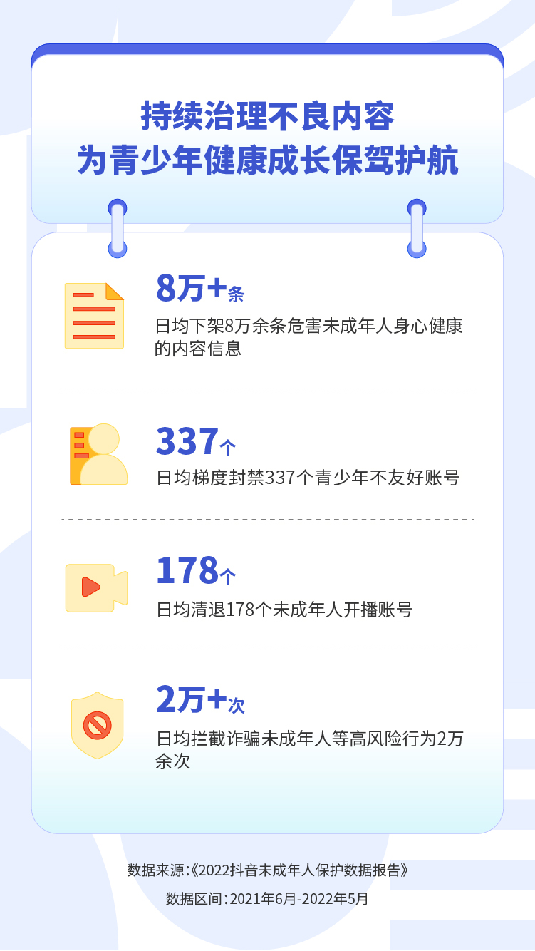 抖音持续通过技术、产品和运营手段持续治理侵犯未成年人权益的账号和内容。报告显示,2021年6月到2022年5月,抖音平均每天下架8万余条危害未成年人身心健康的内容信息,日均梯度封禁337个青少年不友好账号。另外,抖音每天拦截诈骗未成年人等高风险行为2万余次。