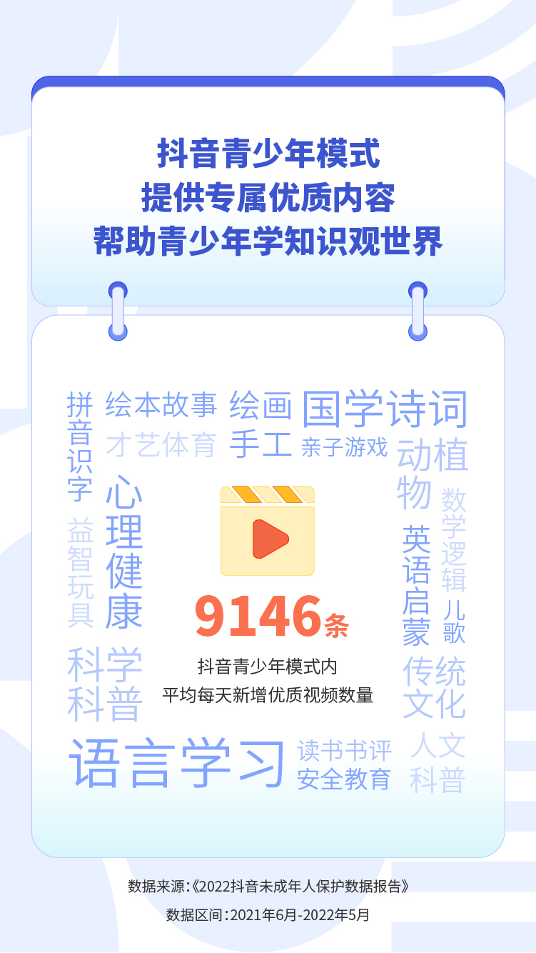 截至目前,抖音青少年模式已经覆盖了包括语言学习、国学诗词、安全教育、才艺体育、传统文化、绘本故事等多个内容类别,平均每天新增优质视频9146条。