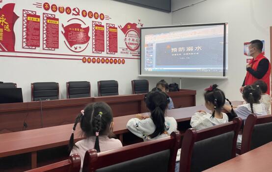 活动中,社区志愿者采用播放“防溺水安全教育”视频和发放宣传彩页的方式,将教育知识与实践互动相结合,孩子们看得聚精会神,加深对预防溺水自防自救知识的印象。