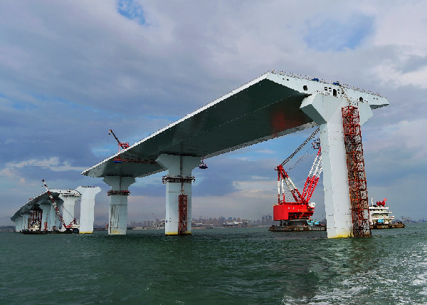 这是采用“拼积木”式预制安装工艺的厦门第二东通道(翔安大桥)海上施工作业现场(6月1日摄)。目前,由中交二航局等单位承建的厦门第二东通道(翔安大桥)施工进展顺利。厦门第二东通道(翔安大桥)全长约12公里。大桥互通区主体结构预计6月30日完成,8月底实现全桥合龙。