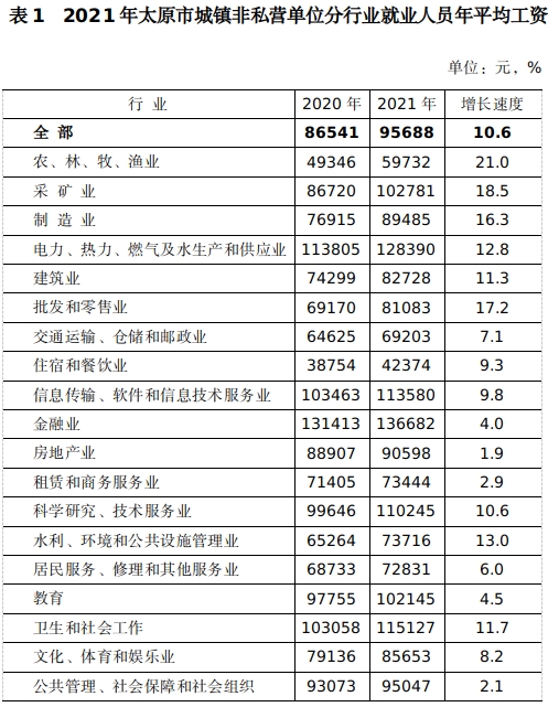 2021年太原市城镇非私营单位就业人员年平均工资95688元
