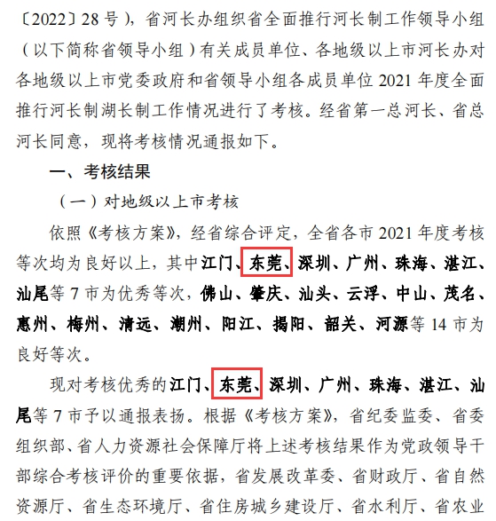 东莞阳光网6月2日讯 近日,省全面推行河长制工作领导小组公布了2021年度全面推行河湖长制工作考核结果,经省综合评定,全省各市2021年度考核等次均为良好以上。其中东莞、深圳、广州、珠海等7市为优秀等次。