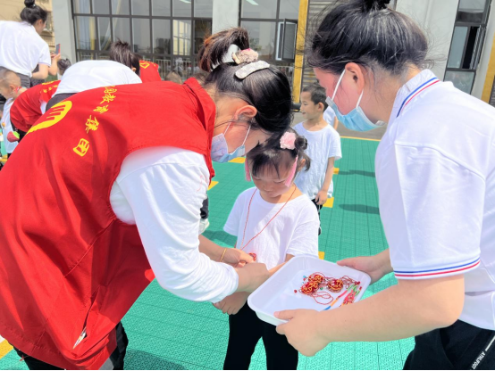 最后老师和家长代表一起为幼儿佩戴香包、扎五彩绳,祈福孩子健康平安。