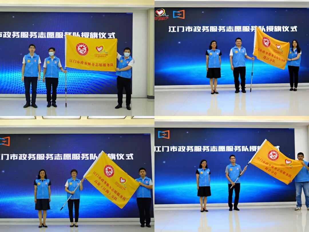 团市委、市政数局、市义工联联合进行了授旗仪式,为江门市政务服务志愿服务队市队和各县(市、区)分队进行授旗。