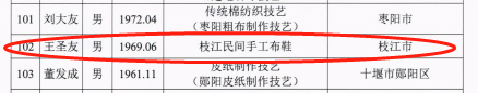 枝江融媒(通讯员 田雯)近日,湖北省第六批省级非物质文化遗产代表性传承人名单正式公布,枝江民间手工布鞋(枝江布鞋制作技艺)传承人王圣友被认定为省级非物质文化遗产代表性传承人。