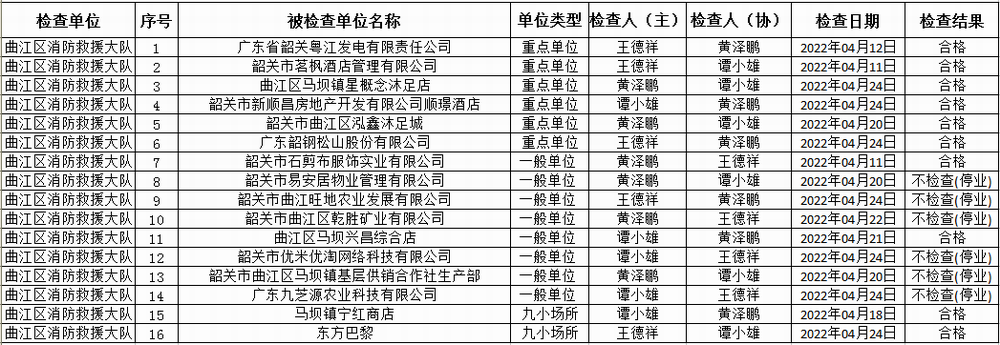 曲江区消防救援大队2022年4月份全区“双随机、一公开”监督抽查结果