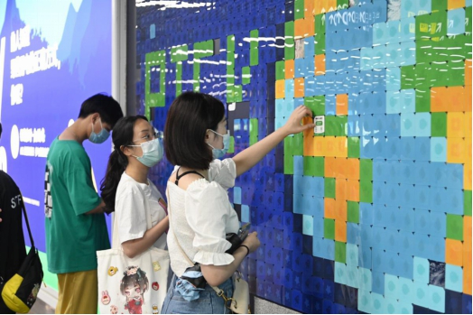 不仅如此,在地铁创意海报之间,还有一面由许多方形磁贴拼成“PICKME”和地球形状的互动装置,每块磁贴绘画着花、草、树、鱼等大自然元素,背面则是微信支付“低碳答题挑战”入口。乘客随手带走一贴,即可扫码磁贴背面参与“低碳答题挑战”。而随着磁贴一块块揭开,“地球”原本的面貌也逐渐展现在眼前。