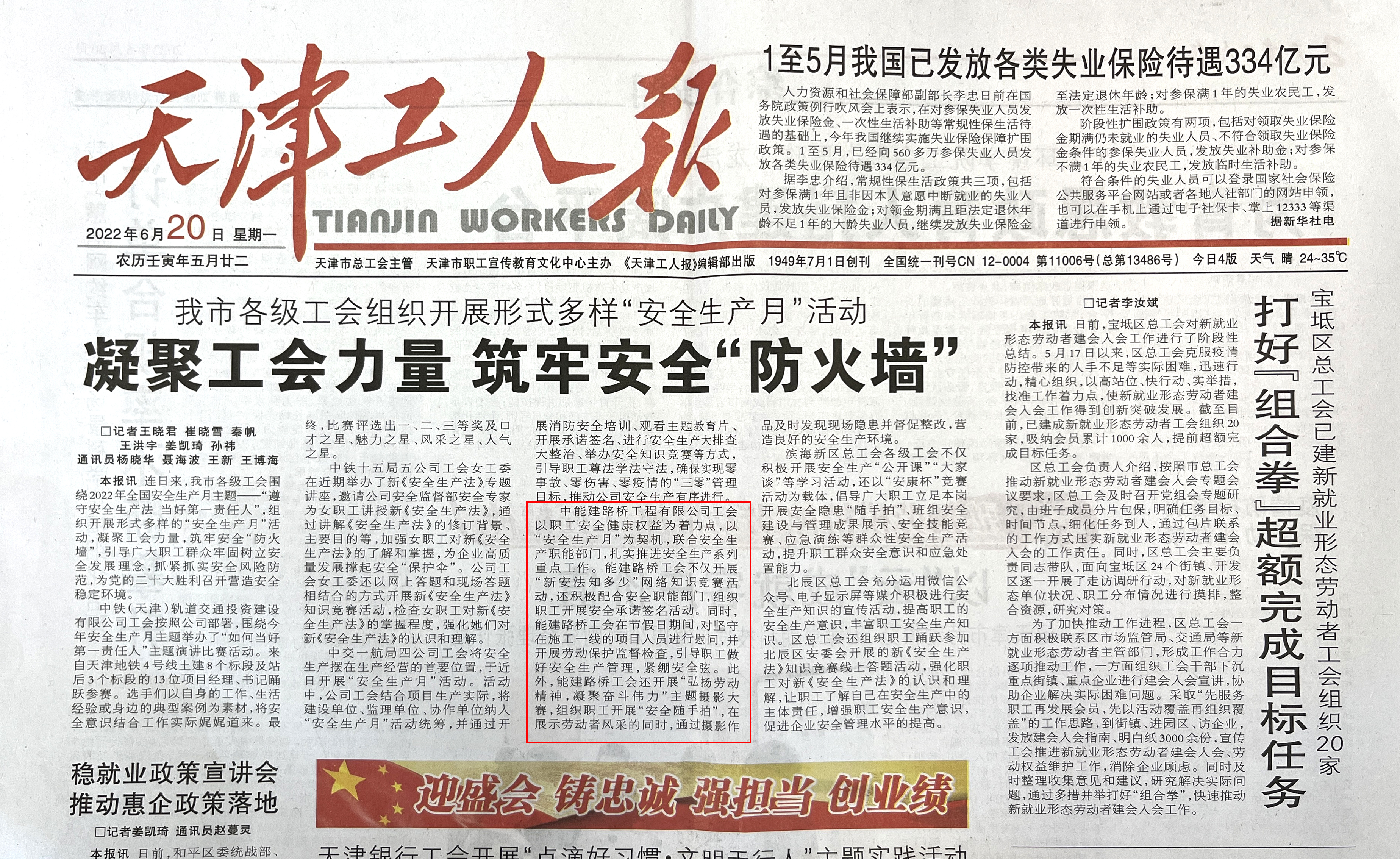 6月20日,天津工人报头版头条《凝聚工会力量筑牢安全“防火墙”》报道中国能建路桥公司工会组织开展形式多样“安全生产月”活动。