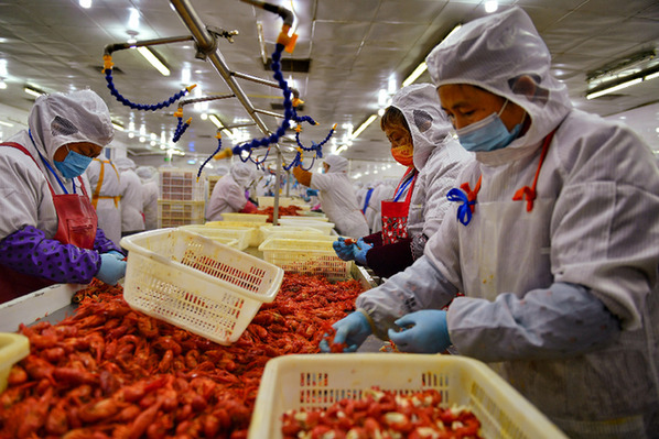 在安徽合肥一家小龙虾深加工企业的车间内,工人们正在加工小龙虾。韦韬 摄