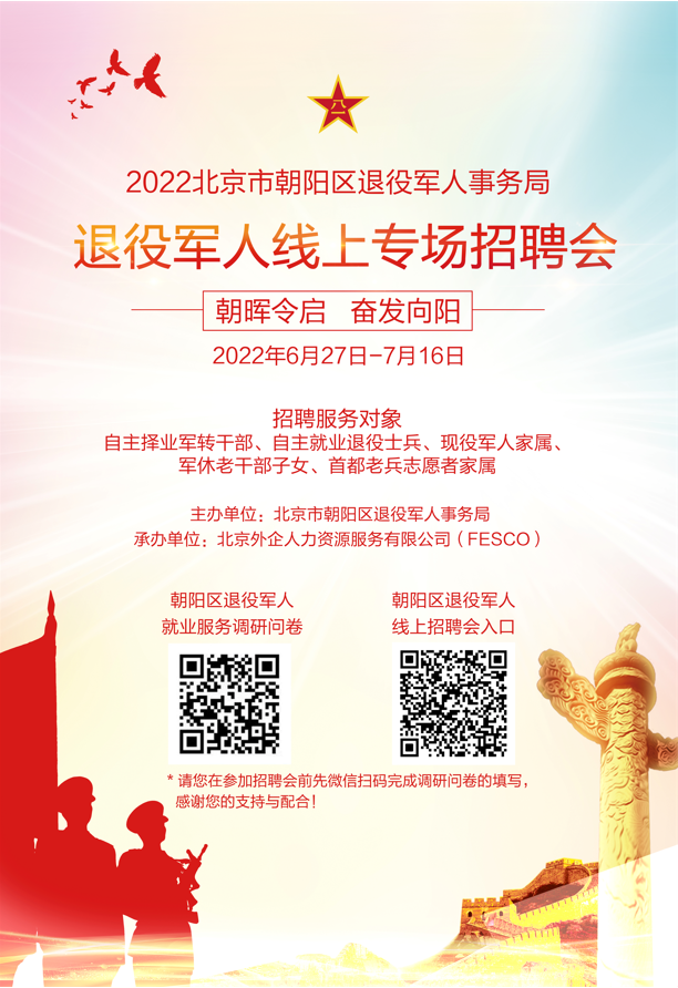 为深入贯彻落实党中央、国务院关于“稳就业、保就业”的决策部署,拓宽退役军人就业渠道,统筹推进退役军人及其家属就业工作,由朝阳区退役军人事务局主办,北京外企人力资源服务有限公司(FESCO)承办的2022年北京市朝阳区退役军人上半年专场招聘会将于6月27日上线。此次线上招聘会共有60家企业提供涉及医疗、互联网、培训、行政、金融、技术、财务、管理、物流、市场营销、物业等多领域共计2000多个就业岗位,招聘会服务对象主要涵盖辖区内自主择业军转干部、自主就业退役士兵、现役军人家属、军休老干部子女、首都老兵志愿者家属等。欢迎扫描海报中的二维码,关注招聘会信息,期待您的参与,祝您成功!