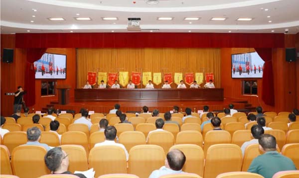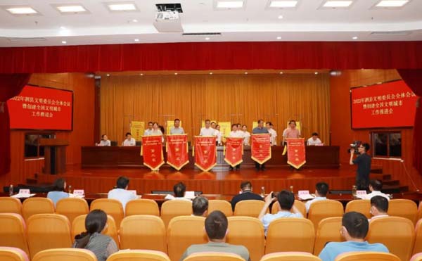 会议播放了文明城市创建视频短片,通报了6月份考评结果,并对考评名次先进和靠后的单位分别进行授旗。