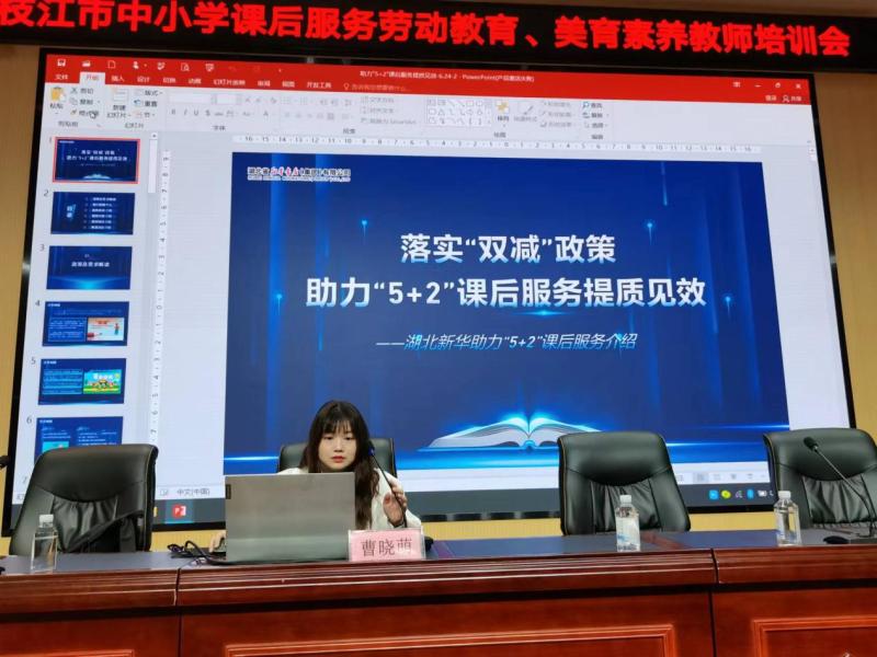 培训会上,湖北新华文化消费服务专员曹晓萌以《落实“双减”政策 助力“5+2”课后服务提质见效》为题,从政策及需求介绍、我们能做什么、服务体系介绍、服务内容介绍、教师培训介绍和展演活动介绍等六个方面,就湖北新华如何助力“5+2”课后服务作全面介绍,倡导以课程标准化、服务体系化、活动品牌化为目标,形成贯通家庭、学校、社会的课后服务机制,助力学生综合素质提高,实现“五育并举”全面发展。