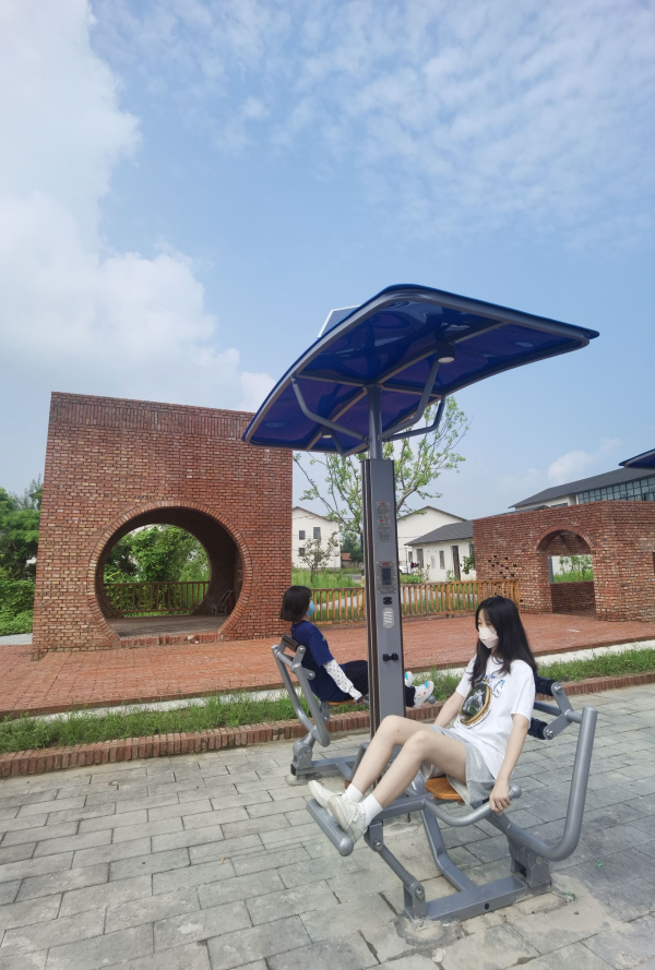 新安装的二代智能健身器材包括智能腹肌板、智能健骑膝关节组合器、智能划船器、智能背部训练器、智能推举训练器等。与普通的健身器材不同,这些健身器材顶部都有太阳能电池班做成的遮阳棚,不仅能遮阳挡雨,还能及时充电。每一台健身器材路径都配备了太阳能电池板,晚上还可以自动照明。此外,居民在运动过程中,只需通过扫描微信二维码进入"全民云健身"小程序,通过数据反馈和动画演示,掌握正确的锻炼动作要领。