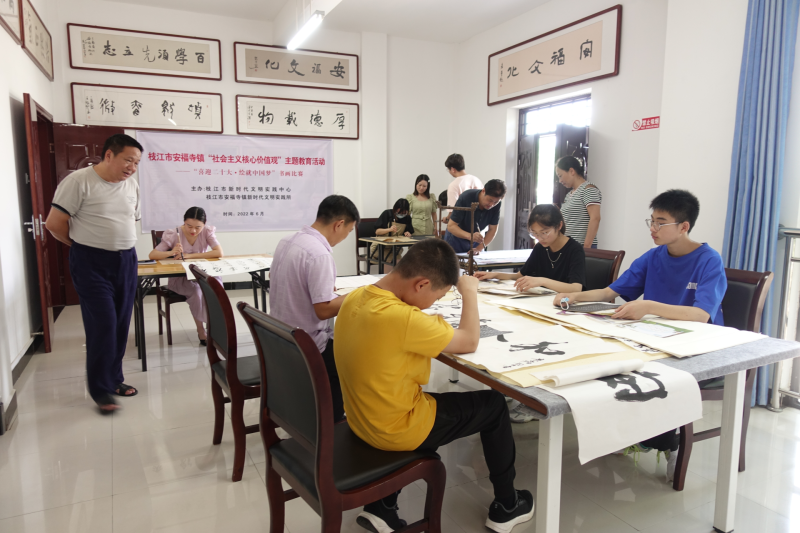 枝江融媒(通讯员 刘骞)传承中华文明,赓续民族精髓。近日,由安福寺镇新时代文明实践所主办、安福寺文化服务中心承办的枝江市安福寺镇“社会主义核心价值观”主题教育活动——“喜迎二十大·绘就中国梦”书画比赛在安福寺镇文化中心书画室举办。来自镇机关、学校、居委会等相关单位近二十名书画爱好者同台竞写,挥毫泼墨,用精心创作直抒胸臆,通过多元视觉抒发爱党爱国之情,喜迎党的二十大召开。