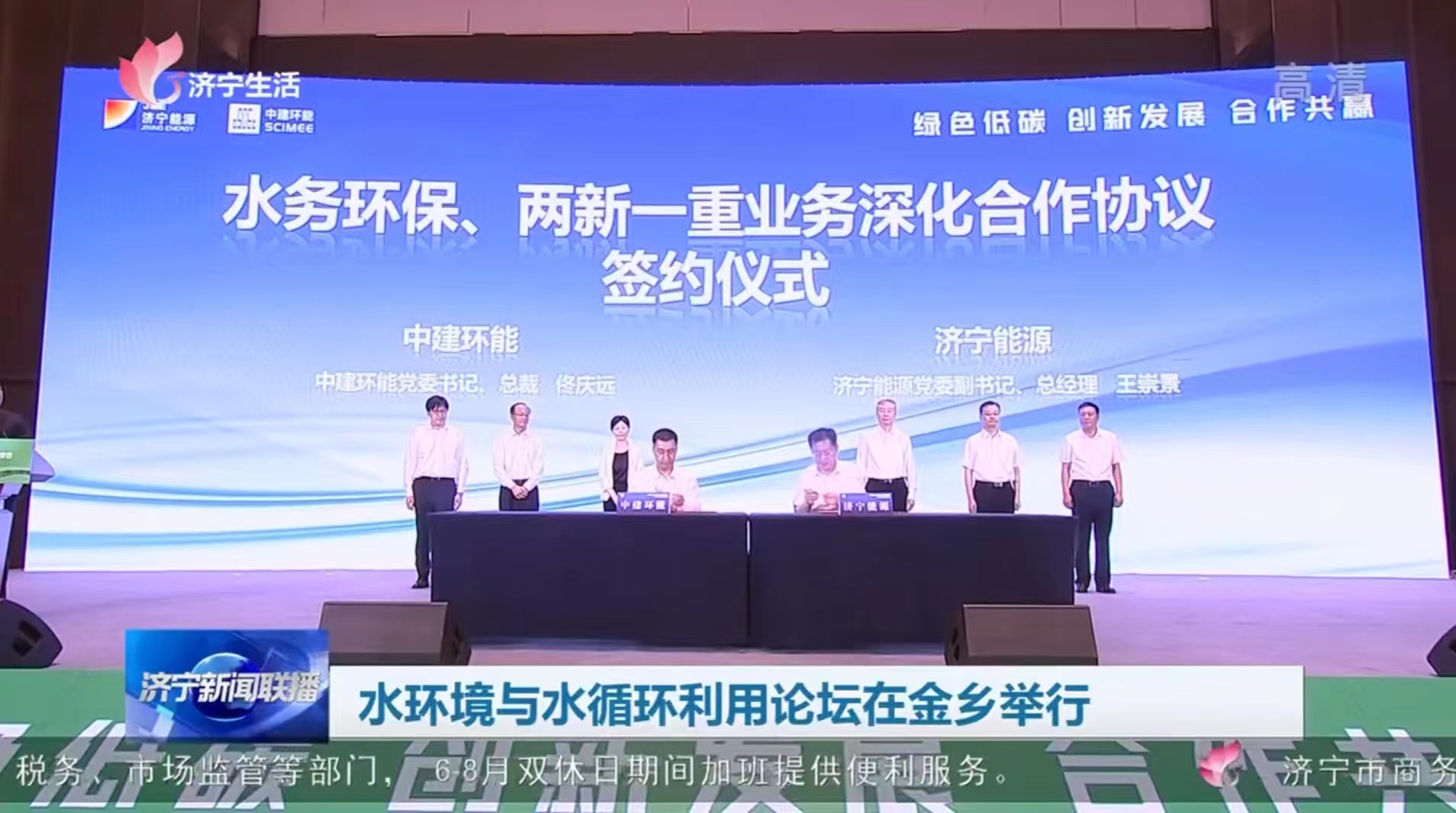 论坛上,举行了济宁能源高盐水资源化利用项目揭牌仪式,中建环能与济宁能源发展集团签署了水务环保、两新一重业务深化合作协议。
