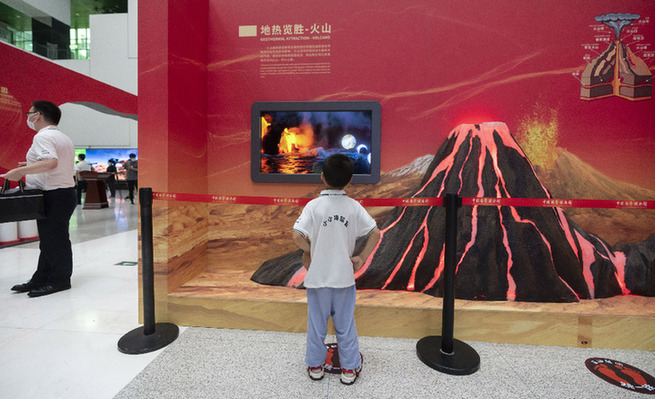 ? 近日,由中国科学技术协会、中国石化集团共同举办的“拥抱双碳 共赢未来”地热科普公益展在中国科技馆开幕。图为一名儿童在中国科技馆参观地热科普公益展。 新华社记者 才扬 摄?
