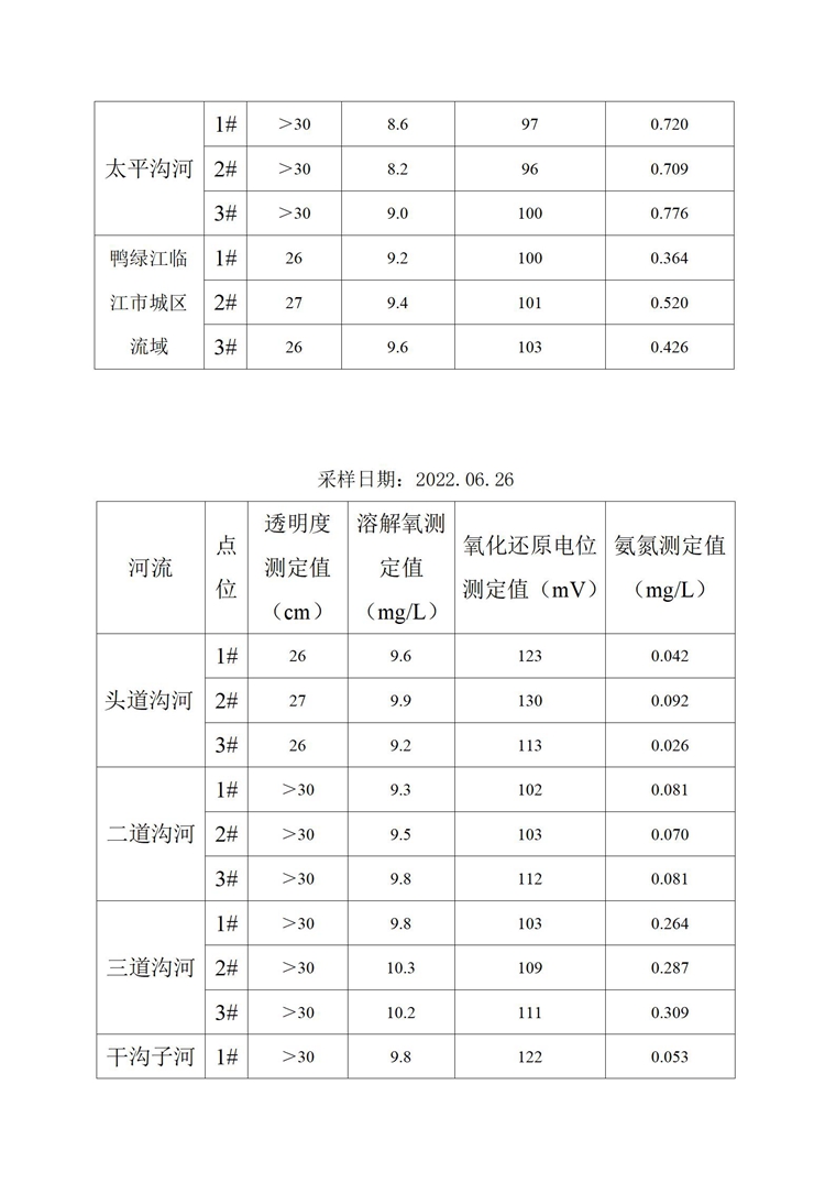 根据每条水体监测点位不少于3个的原则,在六条河流下游及鸭绿江建成区区段布设监测点,共计21个点位作为本次监测点位。监测项目有透明度、溶解氧、氧化还原电位、氨氮4项。分别于6月22日、6月24日、6月26日进行监测,监测频次为3次。