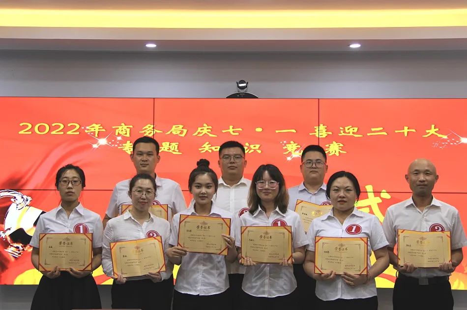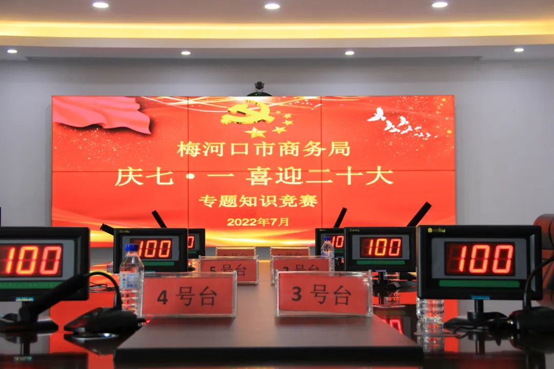7月7日,为庆祝中国共产党成立101周年,丰富党员文化生活,以昂扬姿态迎接党的二十大胜利召开,梅河口市商务局成功举办“庆七·一 喜迎二十大”专题知识竞赛。共6支参赛队伍18名选手角逐名次,商务局领导出席现场观看比赛并为选手颁发荣誉证书。
