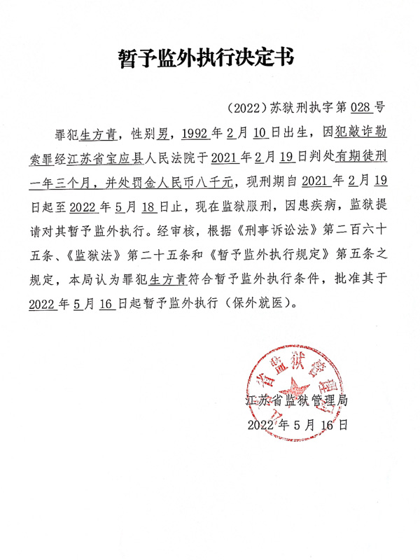 暂予监外执行决定书(2022)苏狱刑执字第028号