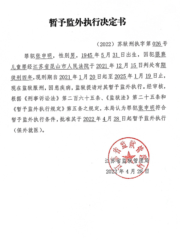 暂予监外执行决定书(2022)苏狱刑执字第026号