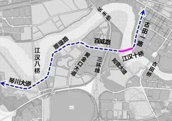 公告显示,该项目西起于黄金口大道什湖路,东止于古田一路长云路口,线路长度约4123米,其中高架桥约2317米(含跨汉江主桥855m),引道188米,地面主线1618米,地面辅路1829米,道路红线宽40—55米。