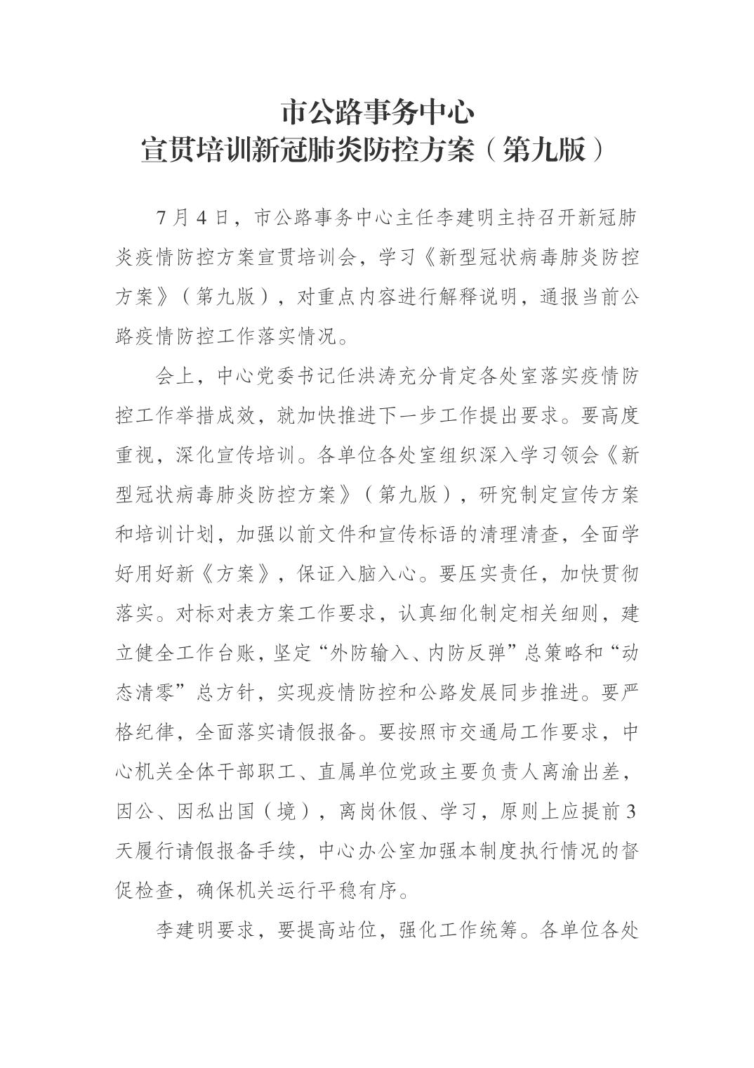 市公路事务中心宣贯培训新冠肺炎防控方案(第九版)
