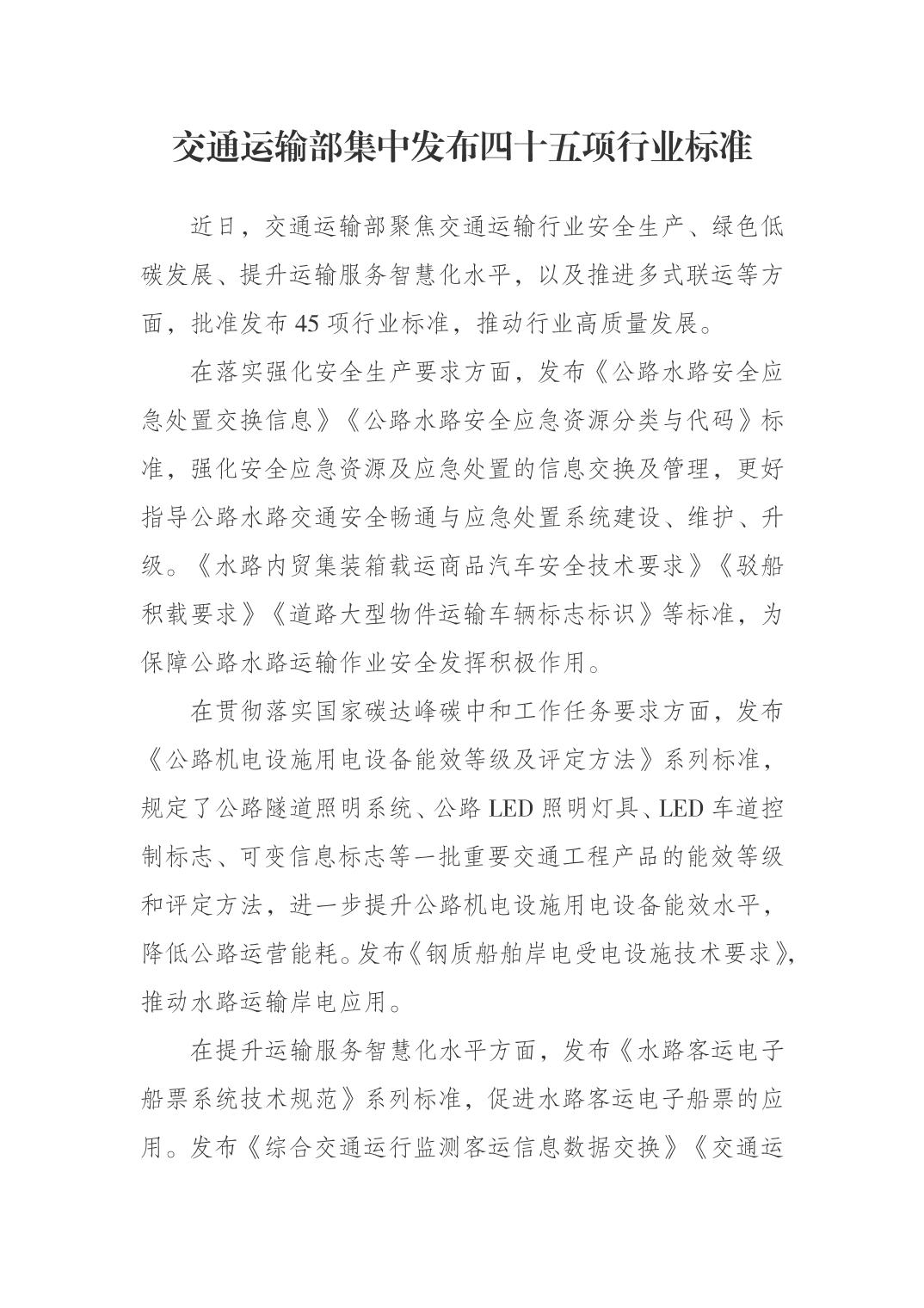 交通运输部集中发布四十五项行业标准
