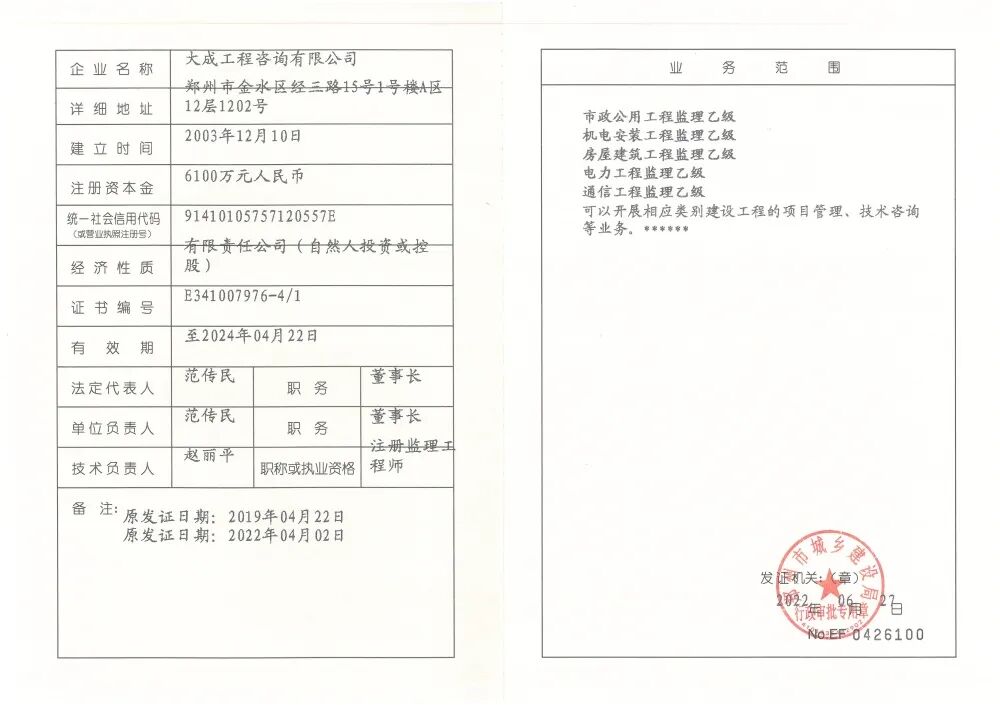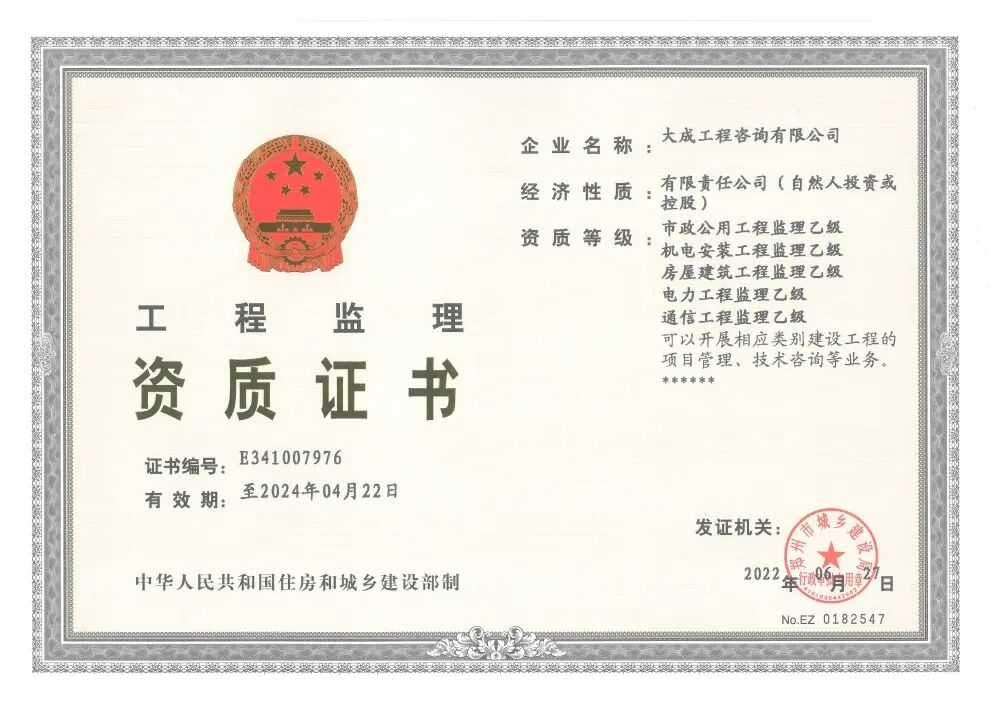 目前,公司拥有五项工程监理专业资质,分别为房屋建筑工程乙级、市政公用工程乙级、机电安装工程乙级、电力工程乙级、通信工程乙级。下一步,公司将全力构建稳固的专业资质体系,不断实现综合实力的升级,为客户带来更优质、高效、专业、全面的服务体验。
