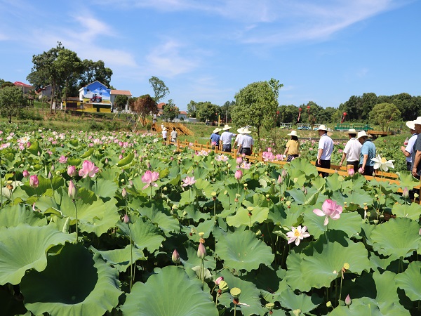 聆听小提琴和大提琴合奏的悠扬歌声,享受沙湾村乡村音乐节;搭乘“乡村振兴号”火车,看看“党旗红”与“乡村绿”交汇融合的乡村沃野;在水上乐园里清凉避暑,体验水上自行车的乐趣,感受水上碰碰船的刺激;坐上竹排制成的一叶轻舟,体会“荷叶五寸荷花娇,贴波不碍画船摇”的平静,晃晃悠悠到风景迤逦的水乡楚韵农家乐。