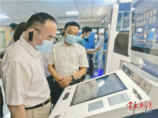 ▲调研组在市政务服务中心,体验我市率先推出的“跨省通办”自助服务一体机。