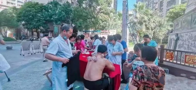 为促进中医健康养生文化的创造性转化、创新性发展,现场通过大型宣传背景布、展板展示,有奖竞答、免费咨询、辨识常见中药材、中医三伏灸宣传、中医理疗-拔火罐、艾灸,发放宣传材料、宣传品等多种形式向过往的群众宣传。医务人员现场为居民普及中医理疗拔火罐、艾灸穴位等常见的普通疾病的保健及理疗,众多居民排队体验;医生还耐心的为他们介绍常见中药材辨识:薄荷、陈皮、党参、当归、黄芩、芡实、茯苓、薏米等平日食用方法。当日免费发放宣传材料:《八段锦套路图解》、《中药煎煮小常识》、《中医养生保健素养》等,宣传品:飘逸杯、购物袋。现场群众对中医药的科学性有了更直观、更深刻的认识。