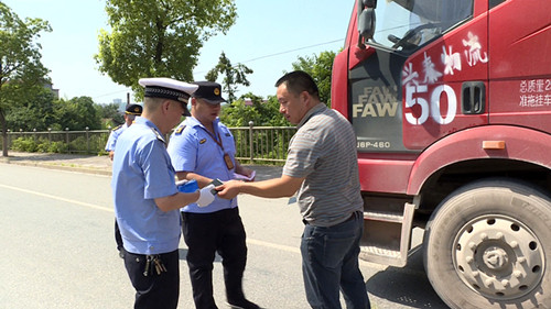 在城区各主次干道,执法人员对过往工程运输车辆等货运车辆进行逐一检查,严查有无超限超载、无牌无证、假牌假证、故意污损号牌、非法改(拼)装等违法行为,进一步规范运输经营行为,维护道路运输安全。