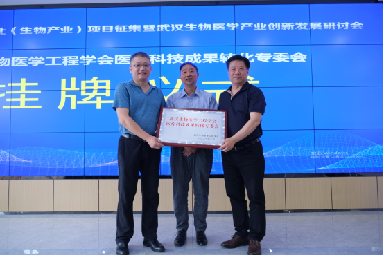 会中,湖北高投赢正医疗科技成果转化中心有限公司、湖北高投创慧产业园运营有限公司和武汉国家生物产业创新基地有限公司签署三方协议。并举行了武汉生物医学工程学会医疗科技成果转化专委会挂牌仪式。由武汉生物医学工程学会秘书长江迅授牌,武汉中心医院科教处胡继发处长和湖北高投赢正总经理陈卫东揭牌。