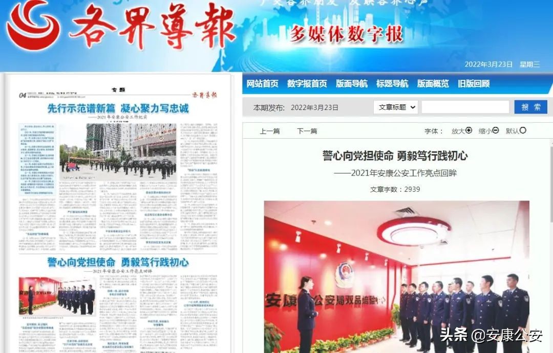 讲好警察故事,践行使命展形象。紧扣“喜迎二十大 忠诚保平安”主题实践和“铭记嘱托 忠诚担当”学习实践活动,安康公安有计划、有重点、有组织对近年来涌现出的先进典型进行集中宣传,及时发现、挖掘、宣传在维护稳定、打击犯罪、服务群众、抢险救灾等工作中涌现出来的忠诚担当、顽强拼搏、无私奉献的先进集体和个人事迹,持续发起宣传攻势,精心组织采编相关宣传新闻稿件,在最短的时间内推出了一系列有深度、有温度、有热度的新闻报道。其中,《除夕,我在巡逻的路上》《警察蓝,“疫”路坚守下的温暖底色!》《战“疫”时刻我们竭“警”所能》《高速路口的守门人》《付官军:数十本荣誉证书见证奋斗的足迹》等报道先后被中、省、市级多家媒体采用刊发。截至目前,中省市媒体宣传报道安康公安机关民辅警和集体先进典型300余人次,先后有57个集体、184名个人被中省市表彰,全方位多角度展示了安康警察形象,传播了安康公安的最美声音。