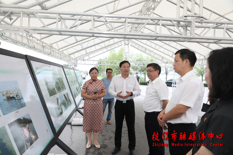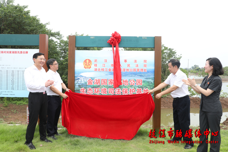 在金湖国家湿地公园,调研组一行察看水生态保护、湖泊综合治理等情况,实地感受枝江良好生态环境,并为共建金湖国家湿地公园生态环境司法保护基地揭牌。